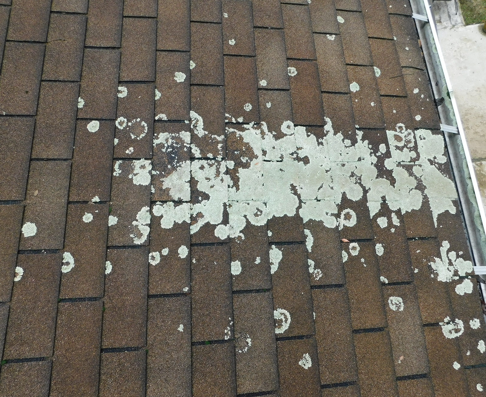 Lichen is a combination of algae and fungus that usually has a light, mint-green color. Although it doesn't trap as much water against the surface of the roof as moss, it can be just as invasive and damaging. Lichen has a heavy penetrating root system that clings deep into the shingles, making it very difficult to remove. Left untreated, the Lichen will actually eat through the granules on your shingles.
